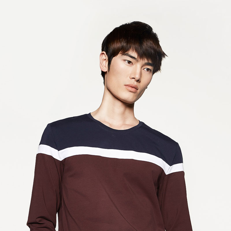 商品名称:HLA/海澜之家撞色长袖T恤春季热卖圆领修身拼接T恤男 简约圆领 微弹修身 撞色拼接 触感柔软